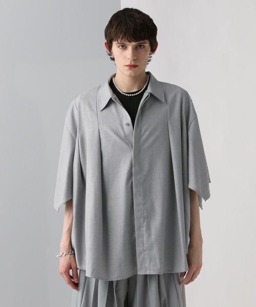 ーーー セットアップ対応 YOSEシリーズからプリーツを入れ込んだポンチョ仕様のシャツが登場 ーーー point □無駄な装飾を入れずに「生地を寄せる」ことで生まれた、個性を表現できる一着。 □着丈を短めに設定し、袖部分をポンチョ仕様にしたデザイン。丸みのあるシルエットでモードない印象に。 □ハリがあり、表面感の綺麗なポリエステル×レーヨン生地を使用。 □同素材のパンツとセットアップで着用可能。 set item セットアップ対応のワイドパンツはコチラ→【115497】 セットアップ対応のバルーンパンツはコチラ→【329215】