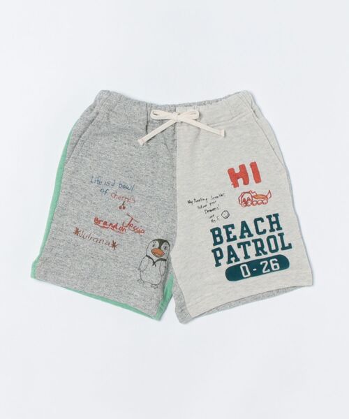 前の落書きと後ろの親子ペンギンのアップリケが可愛い、裏毛ショートパンツ。