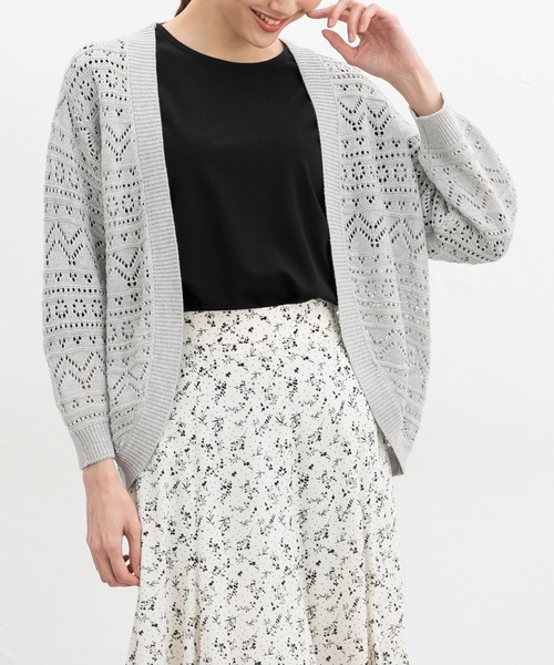 涼しげにフェミニンに 【デザイン】 これからの季節に大活躍の涼しげな透かし編みデザイン。 さっと羽織れるボタンレスで、丸みのあるフェミニンなシルエット。 ゆったりめの幅と腰にかかる丈感。 【素材・機能】 肌触りの良い綿混素材。 【スタイル】 スカート・パンツはもちろん、ワンピースにも合い、幅広い着回しに活躍。 ※8分袖 品番:646-32-1457