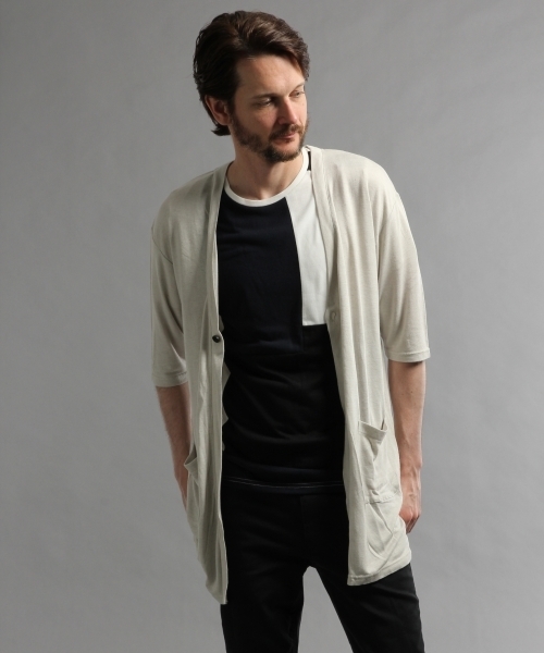 リネン混の薄手の生地を使用したカーディガン。 ニットのような見え方のカットソー素材を使用したアイテム。 リネン混の薄手なので通気性も良く、暑い時期も問題なく合わせて頂きます。 またレーヨン混なので。着用した際に綺麗な落ち感もあり、前開きで着た際、綺麗なドレープ感も出ます。 サイドに前後差を付けたスリットも入れ、羽織りで合わせたスタイリングも◎ 夏の羽織りスタイリングにおすすめのアイテムです。 ※店舗、WEBで在庫をお探しの際は下記の商品番号をお申し付け下さい。 商品番号→【563562】