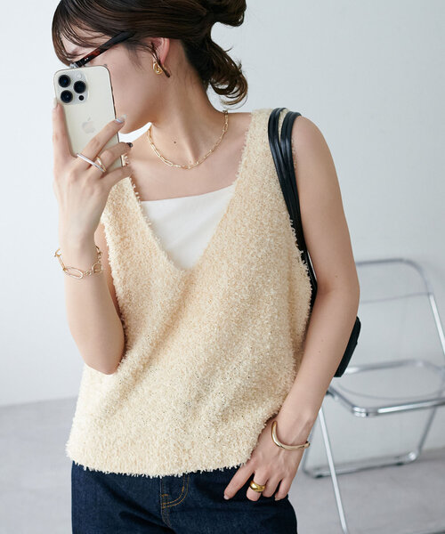 DISCOAT ONLINE LIMITED ITEMふんわりと柔らかな風合いのリボンヤーンベスト・シンプルながら女性らしい柔らかさを演出するデザイン・顔まわりをすっきり見せるVネック仕様・やや長めの丈感で気になる体型もさりげなくカバー◎・インナー次第でロングシーズン着用可能・カジュアルにもきれいめにも合わせやすい着回し力抜群の1枚・立体感のあるリボンヤーン糸を使用・肌あたりもやわらかく、もこもことした質感が特徴です●スタイリング・インナーにキャミソールやタンクトップを合わせて、夏らしい軽やかなレイヤードスタイルに。・シアートップスやシャツとの重ね着もおすすめです。・デニムでカジュアルダウンしたり、スカートで女性らしくまとめても◎▼おすすめのスタイリングアイテムシアープルオーバー 《WEB限定カラーあり》吸水速乾カップ付キャミソール【@yuyukekelife企画】ベルト付き欲張りストレートタックパンツUSコットンデニムストレートパンツ≪改良版≫***********************洗濯方法:手洗い可能裏地:なし透け感:オフホワイトのみややあり伸縮性:ややあり光沢感:なし生地の厚さ:普通***********************【お取り扱いの注意】※着用時、洗濯時は必ず取り扱い表示・タグをご確認の上、お取り扱いください。【カラー表記について】システム上の都合により、一部カラー名がサイト表記と異なる場合がございます。