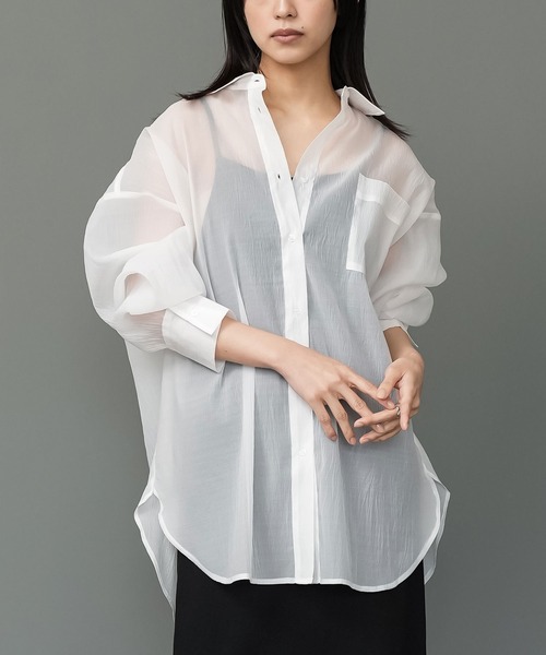 ★ソフトオーガンクレープオーバーシアーシャツ★ ★素材★ 布地の表面に凹凸のあるソフトオーガンクレープ素材を 使用したシャツです☆肌に触れる面積が少ないためさら りとした触感が持続する軽い素材感です◎ ★Detail★ <ミドル丈シャツ> オーバーサイズのミドル丈シャツなので、ヒップライン や腰回りをカバーしてくれます☆薄着になっていく季節 に最適なゆったりサイズのトップスです♪ <レギュラーカラー> 定番のレギュラーカラーはインナーとしてもアウターと して着た時も違和感のないカラーです◎クールな印象に コーデを仕上げるディテールです♪ ★ポイント★ 軽やかな触感のオーバーサイズシアーシャツが登場です !これからの季節にUV・冷房対策として活躍する一枚 あると便利なゆったりサイズのシャツです☆ 透け感:あり 伸縮性:なし 裏地:なし ※モニター・環境等により実際の商品と多少色味が異な って表示される場合がございます。予めご了承ください ますようお願い致します。