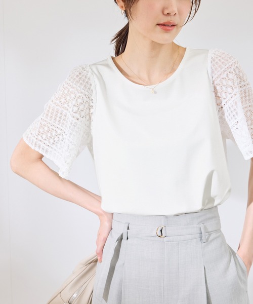 レース素材で切り替えた可愛くなれるデザイントップス!【素材感】・身頃はやや光沢感のあるなめらかな肌触りのカット素材。・UVカット(紫外線遮蔽率90%以上)、ひんやりとした肌触りの接触冷感素材。【デザイン・シルエット】・レース素材のフレアスリーブで切り替えた、異素材ミックスのカットソー。・すっきりとしたラウンドネック。・身幅はややゆとりあり。【カラー】・ブラック、オフホワイト、サックスブルー、ピンクの4色展開。【スタイリングポイント】・モノトーンは、柄物ボトムを引き締める効果あり。・サックスブルーやピンクは、同系色を合わせたワントーンコーデがおすすめ。・落ち感のある上品なスカートと合わせレバ通勤コーデの完成。・同シリーズでKIDS(品番:GRM25020)も展開しているので、親子お揃いも一押し。<「Cutee」シリーズ>・Cutee チュールフリルトップス(品番:GDM15670)・Cutee チュールドッキングツイストスリーブトップス(品番:GDM15680) ・Cutee 着丈が選べる70シルケットペプラムカットトップス(品番:GDM15630)-----------------------------裏地:なし透け感:なし、ホワイト(10)のみあり伸縮性:あり生地感・厚さ:普通季節:春・夏-----------------------------※撮影時の光、お使いのモニター環境によって色の見え方が違う場合がございます。※モデル身長:165cm 着用サイズ:38