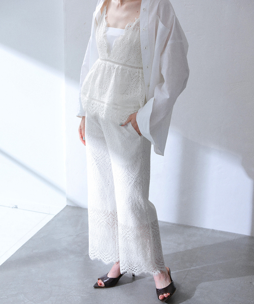 【2025SS】 LaTotalite 大人の可愛さを惹き立てるレースパンツ。 レースは甘さ控えめな柄を採用し、デイリーコーデに取り入れやすいデザインに仕上げました。 裏地は丈を短めに設定することで、足元が透けて軽やかな印象を与えてくれます。 ワイドシルエットは、脚のラインをキレイに見せ、きちんと感を演出。 シャツにジャケットを羽織れば、オフィスにも対応可能です。 休日のお出掛けには、Tシャツにフラットサンダルを合わせリラクシーなスタイルに。 同素材のレースキャミトップスを合わせて、大人フェミニンに着こなすセットアップコーデもオススメです。 ********************** 透け感:ホワイトは多少の透け感あり 裏地:あり 伸縮性:なし 光沢感:なし 生地の厚さ:普通 ********************** ********************** 【スタッフ着用コメント】 《スタッフ名:yukimi》 身長:160cm/体型:普通/普段サイズ:S~M/着用サイズ:36 サイズ感:ウエストはジャストサイズでぴったり。ワンサイズ上げて少しゆとりを持たせても良さそう。 素材感:コットン混のナチュラルな風合いのレース生地 着心地:バックウエストはゴム仕様で、ストレスなく快適な着心地でした ********************** ※シリーズ ウォッシャブルレースキャミトップス 25051140248020 ※取扱いについて 【ブラウン(020):色あせ】 日光や蛍光灯の光に弱く、色あせ(変色)しやすい性質があるので、長時間の直射日光は避けてください。 ※取り扱いについては、商品についている品質表示でご確認ください。 ※照明の関係により、実際よりも色味が違って見える場合があります。 またパソコン・スマートフォンなどの環境により、若干製品と画像のカラーが異なる場合もございます。 ※商品の色味は、商品アップ画像をご参照ください。 モデル身長:164cm 着用サイズ:36 詳細スタッフ身長:162cm 着用サイズ:36 本体:手洗い可能