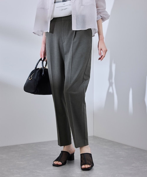 【素材感】 ・シャリ感のある涼しげな素材。 ・さらさらなドライタッチで暑い時期にもおすすめ。 ・グレー(07)ダークブラウン(20)ネイビー(40)はUVカット(紫外線遮蔽率:90%以上)、グレー系(09)はUVケア対応(紫外線遮蔽率:80%以上)。 【デザイン・シルエット】 ・ワンタック入りテーパードパンツ。 ・脚のラインを真っ直ぐ見せるセンタークリース入り。 ・ベルトラインは、サイドがギャザー使いでフィット。 ・すっきりとしたアンクル丈。 ・ウエストのゴムはサイドにあるのでバックスタイルもすっきりと見せてくれる。 【カラー】 ・・チャコールグレー、ライトグレー、モカブラウン、ネイビーのシックな4色展開。 【スタイリングポイント】 ・シャツとパンプス合わせでお仕事着に。 ・同シリーズのジャケットやジレとのセットアップコーデもおすすめ。 ・カットソーとスニーカーでカジュアルダウンもOK。 <リネンライク・シリーズ> ・シアーハーフスリーブジャケット(品番:GDV15220) ・シアーテーラードジャケット(品番:GDV15230) ・ピンタックワイドパンツ(品番:GDS15430) ・ノーラペルジャケット(品番:GDV15300) ・ペプラムジレベスト(品番:GDV15310) ・アイラインスカート(品番:GDC15300) ----------------------------- 裏地:グレー(07)ネイビー(40)はなし、グレー系(09)ダークブラウン(20)はあり 透け感:なし 伸縮性:ややあり 生地感・厚さ:やや薄手 ファスナー:あり ポケット:あり 季節:春・夏 ----------------------------- ※撮影時の光、お使いのモニター環境によって色の見え方が違う場合がございます。 ※前回好評だったリネンライクパンツ(品番:GDS14200)からベルト巾を4.5cmから4.0cmに修正。 ※モデル身長:165cm 着用サイズ:38