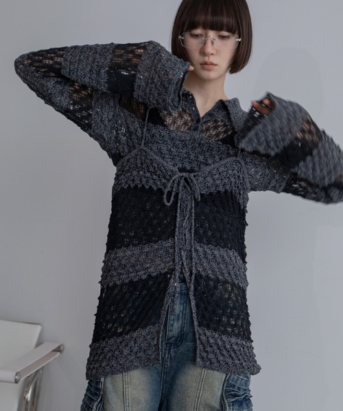 - 2025 VACANCY FALL COLLECTION - ヴィンテージライクな雰囲気を演出するニットキャミソール。 ◆FABRIC 程よく透けるボーダーシアーが涼しげなニットキャミソール。 立体感のあるぽこぽことした編地に フロントリボンを施したエッジが効いたデザインは、 他にないデザインでスタイリングのアクセントに。 フロントのリボンは、外せるのでジレとしても着こなせます。 ストラップは、後ろで結べる仕様な為自由自在です◎ 長めの位置にすると巻きスカートのような着方も楽しめます。 同生地を使用した 透かし編みポロ衿プルオーバー【VCSNC251003】 と重ね着をしてセットアップの着こなしがオススメです。 ◆STYLE 合わせるだけでカジュアルなカットソーやシャツなど、 レイヤードコーデもおしゃれな着こなしに決まるアイテム。 シンプルなスタイリングのアクセントになります。 ジレとしても着こなせる為、 ワンピースやサロペットのベストとしてもオススメです。 ・・・・・・・・・・・・・・・・・・・・ 透け感:あり 裏地:なし 伸縮性:あり 光沢感:なし 生地の厚さ:薄い ・・・・・・・・・・・・・・・・・・・・ 【お買い物をお楽しみいただく為に】 ▼お気に入り登録をオススメ致します▼ ♡をクリックして下さい。 ・《商品のお気に入り登録》で再入荷通知や、ラスト1点の通知、セールの際の通知も受け取ることができます。 ・《ブランドのお気に入り登録》で新作商品や再入荷など、お得な情報を受け取ることができます! 【ATTENTION】 ※画像の商品はサンプルです。 実際の商品と色味、仕様、加工、サイズ、素材等が若干異なる場合がございます。 ※撮影場所やお使いのモニター環境により若干お色味が異なる場合がございます。 ※製品によっては染料の特性上、湿った状態や汗をかいた状態での長時間の放置、または摩擦により、他のものへ色移りする恐れがありますので、着用時にはご注意下さい。 ※お洗濯は洗濯ネットを使用し、他のものとの混合洗いはお避け下さい。色落ちや色移りの原因となります。 タンブラー乾燥はお避け下さい。 ※風通しがよく、湿気の少ない日の当たらない場所で保管して下さい。 ※また製品加工上、お手元に届く際に匂いが生じる場合がありますが、 ご使用を続けていく事により匂いは軽減されます。