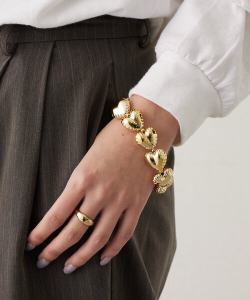 ぷっくりとしたハートモチーフが可愛いブレスレット ●商品コメント 連なったハートモチーフで女性らしさと遊び心があるデザインのブレスレット。 一つ一つのハートがぷっくりとした立体的なフォルムで、シンプルながらも存在感抜群のアイテムです! ゴム仕様なので、付け外しが簡単なのが嬉しいポイント◎ Lara&Heart わがままに... かわいいを楽しむ女性に向けて。 2008年アクセサリー、服飾雑貨ブランドLara&Heartをスタート。 女性にとって永遠のモチーフであるリボンを中心に様々なテイスト、アイテムを提案。 ファッション、カルチャーそして人の心をも結びつけていきたい。そんな思いを込めて物作りをしています。 日常に少しの艶やかさをプラスしてキュートな大人の女性であり続けるために。 ------------------------------------------------------ 商品のお気に入り登録➡ お気に入りアイテムの値下げ・再入荷・在庫1点などの通知を受け取ることができます。 ブランドのお気に入り登録➡ 新商品や再入荷、セール、クーポン配布などお得な情報を受け取ることができます。 ※サイト上のカラー名と、お届け商品に記載されているカラー名が異なる場合がございます。 ※商品の色味は、撮影場所や光のあたり具合などにより色味が違って見える場合が御座います 。 また、お客様のお使いのPCのモニター環境などにより色味が違って見える場合が御座います。予めご了承の上ご注文下さい。 ※ご注文いただいた予約商品のお届け時期の確認は、注文履歴ページより行えます。 ------------------------------------------------------