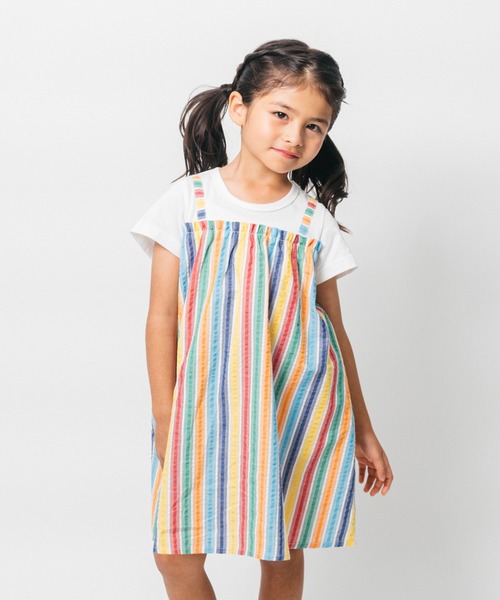 レインボーカラーストライプのキャミワンピと天竺半袖Tシャツのドッキングワンピース。 キャミワンピ部分は凸凹のある部分と平らな部分とでポコポコと縞を表したサッカー素材です。 さらっとして清涼感があり、柔らかくて着心地も良いので夏にはオススメな素材! 鮮やかなカラーで目を惹くアイテムなので、夏のお出掛けにピッタリです♪ 同じレインボーストライプを使った男の子のロンパース(M34703)、女の子のロンパース(M44702)、チュニックTシャツ(M44807)、パンツ(M35103)もあるので、兄弟姉妹やお友達と男女でアイテム違いでペア、リンクコーデ、お揃い、おそろいコーディネートも楽しめます! 【お気に入り登録】 再入荷通知やラスト1点通知、セールのご案内も受け取ることができます! 【ブランドのお気に入り登録】 新作商品や再入荷情報など、お得な情報をいち早く受け取ることができます! ぜひご登録ください♪