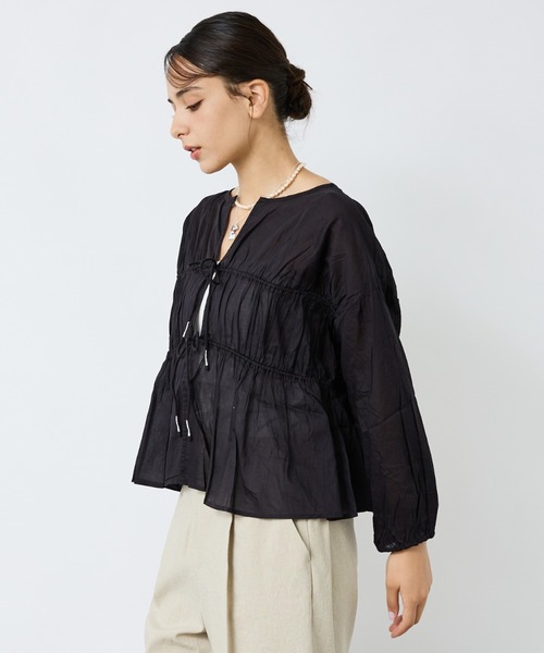 たっぷりギャザーの綺麗めブラウス透け感のあるインドコットンボイル素材。柔らかく粗野で肌馴染みが良く、吸汗・速乾性に優れ、盛夏には本当に快適な素材です。ティアード風にギャザーの入ったブラウス。ストレッチコードで寄せているため、切り替えに立体感があります。なおかつ伸縮性もあるので着心地の良いディテール。紐をだらりと垂らしてラフに、カジュアルなボトムと合わせるのがおすすめ。【注意事項】※商品画像は、光の当たり具合やパソコンなどの閲覧環境により、実際の色味と異なって見える場合がございます。あらかじめご了承ください。【Le Melange/ル・メランジュ】ベーシックを愛しているけれど、 トレンドには敏感でいたい。シンプルなアイテムだからこそ、女性らしい服も好きだけど、 メンズライクな服にも魅力を感じる。ちょっとしたこだわりが欲しい。ベーシックだから、センスやちょっとした気遣いが必要。着てみて納得する着心地の良さや風合いも重視したい。洋服をはじめとして、 身の周りのものは消費するものではなく、”永く愛着を持ち続けられるもの”であってほしい。そんなオーセンティックな女性の為のトラッドなカジュアル。ホワイト モデル:H166 B75 W61 H85 着用サイズ:Fイエロー モデル:H166 B75 W61 H85 着用サイズ:F【商品のお気に入り登録】完売カラーの再入荷通知や、ラスト1点の通知、プライスダウンしたセール通知も受け取ることができます。【ブランドのお気に入り登録】新作や再入荷等、いち早くブランドのお得な情報を受け取ることができます。