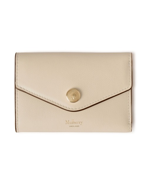 マルベリーロゴが刻印されたスナップボタン付きの折りたたみ式カードウォレット。コンパクトかつ実用的なデザインで、バッグやポケットに入れて持ち運ぶのに便利です。 マルベリーロゴの箔押しエンボス加工 スナップボタンにマルベリーツリーロゴ 内側に箔押しエンボス加工のマルベリーツリーロゴ ジップコンパートメント1つ 内側にスリップポケット2つ 内側にカードポケット6つ 紙幣入れ1つ ソフトゴールド仕上げの金具 ナッパレザーとモアレ素材の裏地 高さ: 8cm/幅: 11.5cm/マチ: 3cm