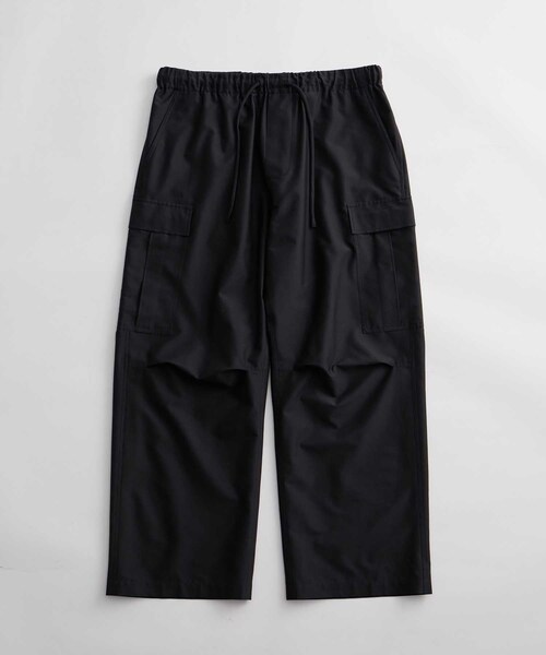 来たる夏の暑さに耐えうる機能を兼ね備えた、アダム エ ロペ オムの提案する超軽量アイテム 【素材】 高伸縮機能糸で作成した、超軽量、ストレッチ性、イージーケア、超速乾の機能を備えたトリコット素材。 高温多湿で暑い時期の長い、現代の気候にマッチした生地となっています。 タテ編みの中でもヨコ糸挿入という特殊な編み方法で、まるで布帛のような仕上がりに。 また、通常よりタテ糸の打ち込み本数を減らして超軽量化素材を作っています。 原料は環境に配慮した再生ポリエステルを採用。 カラーは黒と夏に重すぎないTOPチャコールの2色で展開しており、飾らない凛としたモード感と強さが際立つ色合いとなっています。 【シルエット・ディティール】 本格的なカーゴパンツのディティールでありながらも超軽量な着用感を楽しんでいただける1着です。 カーゴパンツは穿きたいけど、重そうとかコスプレっぽいとかカジュアル過ぎるというイメージで敬遠されていた方には特にオススメです。 特徴的なディティールは活かしつつ、ウエストはゴム+ヒモの楽チンなイージー仕様にしてるので、気兼ねなく着用していただけます。 ポケットも多いので、バックレスで手ぶらで出掛けられるのも嬉しいポイントです。 同素材のバンドカラーシャツはこちら 同素材のワイドショーツはこちら 【モデル着用情報】 長髪:Height:184cm Bust:83cm Waist:70cm Hip:91cm Lサイズ着用 【推奨サイズ】 サイズM:身長〜175cm サイズL:身長176cm〜 ※標準体型を基にした目安になります。 ----------------------- 裏地:なし 光沢感:微光沢 透け感:ややあり ポケット:あり(6か所) 伸縮性:あり 生地の厚さ:薄手 -----------------------