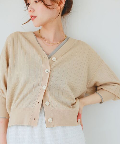 清涼感のあるシアー素材のカーディガン。 今シーズンはワイドリブの編地変化をつけて登場! ●ポイント リブ編みにすることで表面にポイントが加わりました。 程よいシアー感とほんのり光沢感のある糸を使用し、上品な大人の雰囲気を演出してくれます。 首元がすっきり見えるVネックデザイン。 ●おすすめコーデ 身頃は身体のラインを拾わないゆとりのあるシルエットとコンパクトな着丈で、スタイリングにトレンド感と軽やかさをプラスしてくれるおすすめの1枚です。 【スタッフ着用コメント】 〈スタッフA〉 20代後半/158cm/骨格ストレート/普段サイズM/着用サイズ38 サイズ感 :体のラインを拾わない程度にコンパクトめ。 素材感: 薄手でなめらかなニット素材。少し透け感があります。 着用感: 肌触りもサラッとしていて着心地◎初夏の羽織りにもおすすめです。 ※取り扱いについては、商品についている洗濯表示にてご確認下さい。 ※照明の関係により、実際よりも色味が違って見える場合がありますまたパソコン・スマートフォンなどの環境により、若干製品と画像のカラーが異なる場合もございます。 ※商品の色味は、商品アップ画像をご参照ください。 【注意事項】 ・画像の商品はサンプルです。 ・サイズ表記はあくまで目安となります。 実際の商品と仕様、加工が若干異なる場合があります。