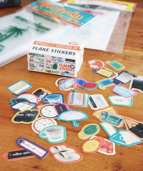 niko and ...の人気アイテムがいっぱい詰まったフレークシール niko and ...の人気商品や人気キャラクターのビリー、あのカフェメニューがシールになりました! すべてデザインが違う、ホログラムシールになっています。 段ボールのようなパッケージも遊び心満点。 お手紙や手帳、ノートのデコレーションや透明なスマホケースに挟んでも◎ たっぷり40枚入っているので、お友達とシェアしても楽しいオリジナルアイテムです!