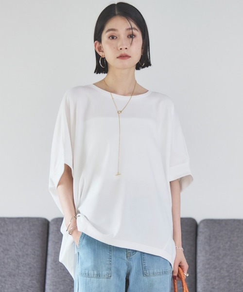 機能性がうれしいラクチントップス 【point】 ・ゆったりとしたサイズ感でラクな着心地 ・前後差のある着丈やドルマンスリーブが気になる部分をさりげなくカバー ・夏の定番アイテムとして全色揃えたくなるアイテムです! 【fabric】 ・UVカット機能で夏の日差し対策に ・吸水速乾素材でさらっとした着心地で、すぐ乾くのがうれしい ・綿混で柔らかな肌触り ・ご自宅でのお手入れ可能 透け感:オフホワイトあり 裏地:なし 伸縮性:あり 光沢感:なし 生地の厚さ:普通 ********************** 【スタッフ着用コメント】 身長:156cm/体型:普通/普段サイズ:M/着用サイズ:38 サイズ感:全体的にゆったりしていて身体が泳ぐようなゆるさです。前後差のある着丈でヒップが隠れるくらいの長さです。袖丈もちょうど肘がかくれるくらいなので二の腕が気にならないのがうれしい。 素材感:つるっとした滑らかな生地。さらさらで肌離れもよいです。 着心地:ゆったりしたトップスでも立体的なシルエットとキレイめな素材感で野暮ったくならない優秀トップスです!ラクなのにきちんと感もあるので色違いで欲しいです。アクセサリーやシューズの合わせでオンオフどちらも着られます! ********************** 【注意事項】 ・画像の商品はサンプルです。 実際の商品と仕様、加工が若干異なる場合があります。 ・サイズ表記はあくまで目安となります。 ・取り扱いについては、商品についている品質表示でご確認ください。 ・照明の関係により、実際より明るく見える場合がございます。またパソコンなどの環境により、製品と画像のカラーが若干異なる場合がございますので、予めご了承くださいませ。 ■お気に入り登録がオススメです!■ 《商品のお気に入り登録》 カラー・サイズ選択の横の「♡」をクリックで簡単に登録できます 完売カラーの再入荷や在庫が1点になったとき、セールになったときに通知をお届けします 《ブランドのお気に入り登録》 ページ上部のブランド名の「♡ お気に入りブランドに追加」をクリックで簡単に登録できます 新商品の情報やイベントなどお得な情報をいち早くお届けします 是非、ご登録お願いします♪