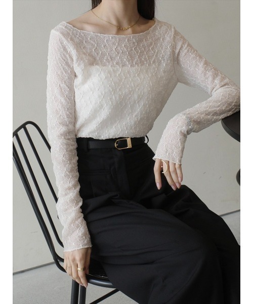 【デザイン&ディテールポイント】繊細な総レースが目を惹き、ボートネックでナチュラルな肌見せが叶います。程よくタイトなサイズ感と、長めに作られたお袖がレディライクに。ボートネックはデコルテを綺麗に見せ、女性らしさを演出。ソフトタッチな素材感で、ストレスフリーな着心地。主役トップスとしてはもちろん、レイヤードアイテムやジャケットにインしても着用いただける万能アイテムです。【コーディネートポイント】ビスチェやキャミワンピのインナーとしても万能です。ジャケットと合わせてフォーマルなスタイルにも。着まわし次第でオールシーズン着用でき、一枚あるとコーデの幅が広がります。アイボリー、ブラックの2色展開。-----------------【Fabric】厚み:薄手伸縮性:ある肌触り:普通裏地:なし透け感:ある-----------------