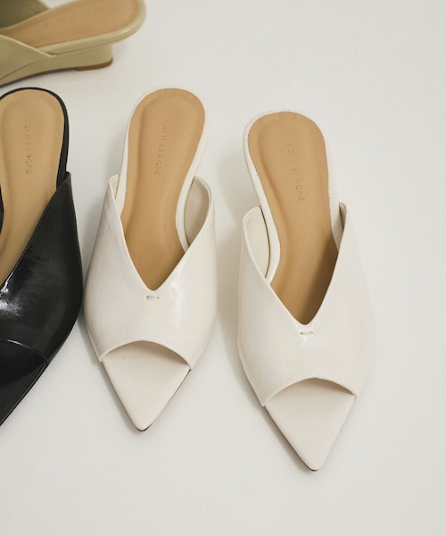 ◇2025春夏◇ ADAM ET ROPE' FEMME 【Material】 程よい光沢感のあるソフトなレザー調のフェイクレザーを使用。 【Design】 履き口部分は足がきれいに見えるようこだわりのカッティング。 太糸のワンポイントはさりげないデザイン性をプラス。 つま先の程よいバランスの取れたポインテッドトゥと、変形型のウェッジヒールはシルエットが美しいバランスの取れたデザイン。 ミドル高のヒールは安定感も良く、シルエットや履き姿にこだわったオリジナルデザインの1足。 【Color】 モードに足元が決まるブラック、クリーンな印象のオフホワイト、色味にこだわったニュアンスベージュの3色展開。 【Styling Point】 ルーズなシルエットに、ワイドな裾から履き口のカッティングデザインをのぞかせるバランスも素敵。 デニムなどカジュアルなボトムスに合わせても馴染みやすい1足。