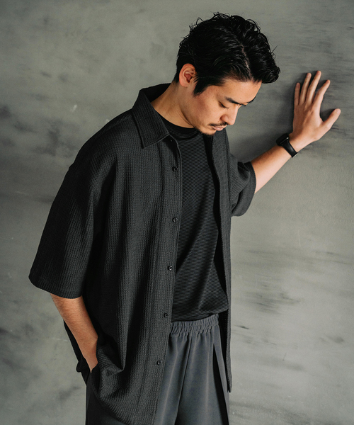 ・程良くゆとりのあるサイズ感のワンピースカラー(一枚衿)のシャツ ・ウェーブ形状の凹凸感のある生地の表面に小さなメッシュ調の穴が開いた素材を使用 ・ドライな質感なので、肌離れと通気性に長けた素材 【ご注意】 ※照明の関係により、実際よりも色味が違って見える場合があります。 またパソコン・スマートフォンなどの環境により、若干製品と画像のカラーが異なる場合もございます。 ※商品の色味は、商品アップ画像をご参照ください。 本体:手洗い可能