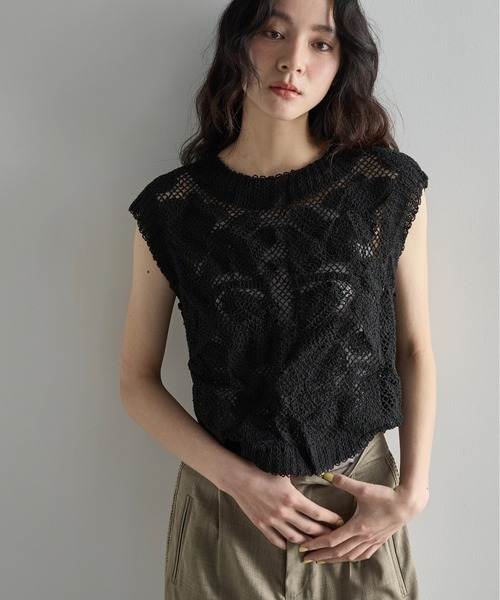 THE YOn 2025 Summer Collection 重ねても軽やかな透かし編みベスト 【Design】 季節感のあるコットン糸で透けのあるデザインに仕上げたアイテム。 存在感のあるフラワーモチーフの編み地がポイント。 首元や裾の丸みで柔らかな雰囲気を演出しました。 ナチュラルな素材感とコンパクトなサイジングのメリハリが魅力。 【Styling Point】 カラーもののインナーでさりげなく色を差すのもおすすめ。 短丈なのでワイドなボトムスもすっきりとしたバランスで着こなせます。 --------------------------------- 裏地:なし 光沢感:なし 透け感:あり 伸縮性:なし 生地の厚さ:普通 --------------------------------- 【お買い物をお楽しみいただく為に】 ▼お気に入り登録をオススメ致します。 『♡』をクリックして下さい。 ・《商品のお気に入り登録》で再入荷通知や、ラスト1点の通知、セールの際の通知も受け取ることができます。 ・《ブランドのお気に入り登録》で新作商品や再入荷など、お得な情報を受け取ることができます。 【ATTENTION】 ※画像の商品はサンプルです。 実際の商品と色味、仕様、加工、サイズ、素材等が若干異なる場合がございます。 ※撮影場所やお使いのモニター環境により若干お色味が異なる場合がございます。 ※製品によっては染料の特性上、湿った状態や汗をかいた状態での長時間の放置、または摩擦により、他のものへ色移りする恐れがありますので、着用時にはご注意下さい。 ※風通しがよく、湿気の少ない日の当たらない場所で保管して下さい。 ※また製品加工上、お手元に届く際に匂いが生じる場合がありますが、 ご使用を続けていく事により匂いは軽減されます。