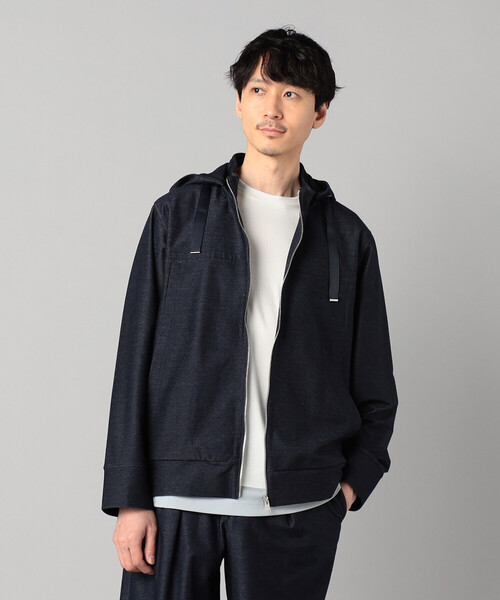 《デザイン》ややゆったりとしたシルエットのフルジップフーディーです。フードは着脱可能で、フードを外すとスタンドカラーのフルジップになります。フロントには、通常より幅が広く、光沢感のあるエクセラファスナーをセレクトしています。エレメント一つ一つに入念な磨きをかけ美しさと滑らかな手触りを追求した特別なファスナーです。またスライダーはオリジナルデザインでメタルの質感にこだわっています。フード付きのデザインで、寒い季節にも暖かさを保ちます。《素材》この素材は、見た目が布帛のデニムライクに見えるジャージー素材です。高伸縮性のポリエステル糸とネイビーの綿糸をカルゼ調に編むことで、デニムのような外観を持つジャージーに仕上げています。カルゼ調の編み方により、デニムの風合いを再現しつつ、ジャージー特有の柔らかさと快適さを兼ね備えています。ハイゲージで編み立てているため、肘や膝の部分が抜けにくいという特長徴があります。また、先染めのため毛羽立ちが少なく、綺麗な表面が特長です。