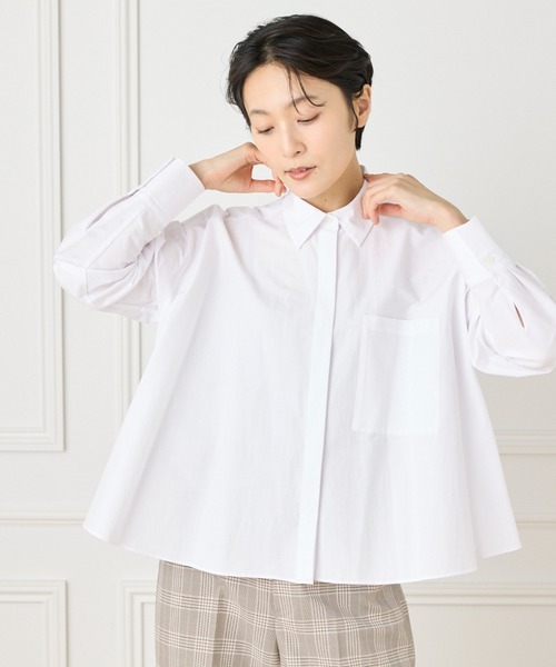 バックスタイルのフレアーシルエットが美しいデザインシャツ。敢えてディティールを削ぎ落しミニマムなシルエットに仕上げています。ラウンドさせたフロントのヘムラインが女性らしい印象です。ワイドなカフスは折り返すと表情が変わり、すっきりとした着こなしもおすすめ。表情豊かなシルエットが1着で着映えスタイルを叶えます。・水洗い可■サンプル撮影商品■こちらの商品はサンプルでの撮影となっております。実際の商品とは、サイズや色味、素材、デザイン等の仕様が若干変更になる場合がございます。