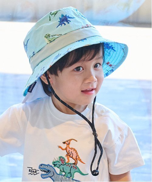 機能性にこだわった総柄のアウトドアハットです。ベージュは乗り物柄、エメラルドグリーンは恐竜柄をデザイン。垂れ布セットで、使わない時はつけ外しもできます。他にもすべり部分の接触冷感生地やベンチレーション仕様、ヘッドクーラーが装着できるループを完備。リフレクターつきのあご紐をほどこしており、暗い道でも安心です。お好みのサイズ感に調整できます。内側にお名前を記入できるタグつき。