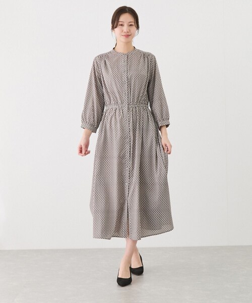 【デザイン・シルエット】 上品で落ち着いた印象の幾何学柄ワンピース。 コーディネートの主役になる、存在感のあるデザイン。 ウエストはゴム仕様でイージーな着心地も魅力。 バンドカラーできちんと感もあり、オフィスコーデにもおすすめです。 【素材感】 滑らかで落ち感のある生地 【カラー】 01 クロ 15 オフ 76 レンガ 【スタイリングポイント】 1枚で着映えするワンピースは足元や小物で印象を変えて楽しめます。 ポリエステル素材でシワになりにくく旅行にも◎ 1枚で存在感があり、ジャケットやカーディガンを合わせたきれいめスタイルにもおすすめ。 裏地:なし 光沢感:なし 透け感:あり ポケット:あり 伸縮性:なし 生地の厚さ:普通 ボタン:あり その他仕様:ウエストゴム 季節:オールシーズン ※撮影時の光、お使いのモニター環境によって色の見え方が違う場合がございます。予めご了承ください。 モデル身長:172cm 着用サイズ:M