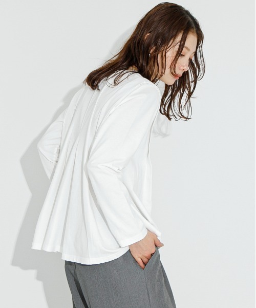 こだわったバックシルエットが一枚で様になる主役級カットソーバックタックとフレアシルエットがポイントのカットソー。お手入れのしやすいカットソー素材で、カジュアルながらもきちんと感も兼ね備えた1枚。POINT・オンオフ兼用で着られるデザイン・1枚でサマになるデザインCOORDINATE広がりのあるデザインですが前身頃は短めで作られているので、ワイドパンツと合わせてもすっきり感が出ます。袖周りはすっきりとベーシックなデザインなのでアウターやカーディガンのインナーとしても◎【2025 Spring/Summer】【25SS】※商品画像は、光の当たり具合やパソコンなどの閲覧環境により、実際の色味と異なって見える場合がございます。予めご了承ください。※商品の色味の目安は、商品単体の画像をご参照ください。▼お気に入り登録のおすすめ▼お気に入り登録商品は、マイページにて現在の価格情報や在庫状況の確認が可能です。 お買い物リストの管理に是非ご利用下さい。素材感透け感 : ややあり(オフ)伸縮性 : ややあり裏地 : なし光沢 : なしポケット : なしFREE