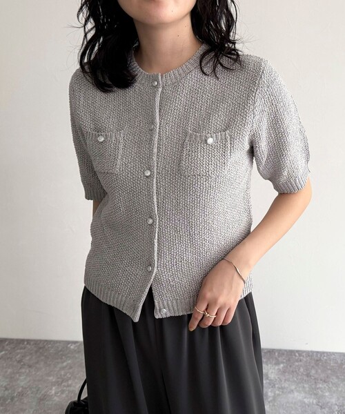 ◇fredy emue◇ 【2025 SS】 コンパクト目のシルエットが今っぽいテープヤーン半袖ニットジャケット ●point ・ふわっとした肌触りが魅力のテープヤーン半袖ジャケットです ・シンプルなコンパクトフォルムのデザインに表面感のある素材を使用 ・胸元のミニポケットや高見えする釦もポイントです ・伸縮性に優れた素材で着心地の良さも魅力的◎ ・1枚でトップス風に着るのはもちろん、羽織としても重宝します ・トレンドライクなショート丈で、フェミニンからカジュアルまで幅広いコーディネートに活躍してくれるアイテムです 透け感:ややあり 裏地:なし 伸縮性:あり 光沢感:オフホワイトとライトグレーはラメ入りです 洗濯:手洗い可 ●お取扱い上のご注意● *商品を長くご愛用していただきたいため、アテンションタグがある場合は必ずご確認の上、着用又はお取り扱い下さい。 *画像の商品はサンプルとなりますので実際の商品と仕様(主にファスナー・釦等の付属品)、加工、サイズが若干異なる場合がございます。 *店頭及び屋外での撮影画像は、光の当たり具合で色味が違って見える場合があります。商品の色味は、スタジオ撮影の画像をご参照下さい。 *商品画像に関しては出来る限り忠実に表示出来るよう努めておりますが、お客様がご利用のモニターの設定及び特性により、実際の商品と比較し色味に若干の誤差が生じる場合があります。 *製品洗い加工の商品は、多少の歪み、シワなどが見られたり、風合いやサイズ等が1枚1枚異なります。汗や雨等で濡れた時や、摩擦により色落ちし、他の衣料を汚すことがありますので(特に濃色のもの)ご注意ください。 ※サンプルでの採寸のため、サイズ表はあくまで目安となります。予めご了承ください。 ◇商品のお気に入り登録◇ 気になる商品は、お気に入り登録がオススメです! クーポン情報、入荷情報が、通知されるようになります。