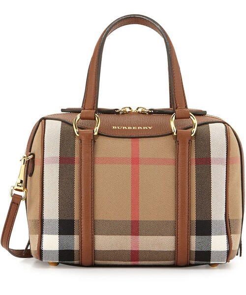Burberry check canvas satchel with leather accents.Rolled top handles with rings extend down body.Removable shoulder strap.Logo embossing at top center.Two-way zip top.Inside: canvas lining; one zip and one open pocket.7.9"H x 6.7"W x 2.2"D.Made in Italy.