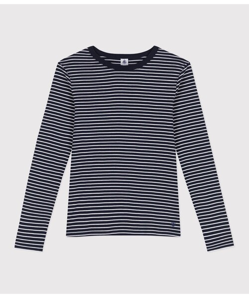 プチバトーを代表するミニマリニエールボーダーのクルーネック長袖Tシャツです。環境にやさしく、第二の肌と呼ばれるほど心地よい肌触りの1x1リブ編み素材を使用した快適な着用感を実現。裾にあしらわれたブランドプリントがさりげないアクセントに利いた、通年で着用可能な人気アイテムです。※濃色の製品は、摩擦や洗濯の際に色落ちや色移りをする場合があります。中性洗剤で単独洗いをしてください。