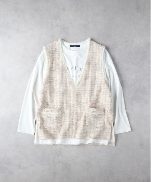 シンプルになりがちな春・初夏スタイルを一段と引き立てるアクセントとなる一枚 【Design】 ・フリンジ使いと深いVネックが特徴のツイードベストと長袖Tシャツがセットになったアイテム ・前身に施されたデザインや深めのVネックが、洗練された印象を与えます ・インナーの箔プリントロゴがちらりと見え、セットで着用することでスタイリングに奥行きを加えます 【Fabric】 ・テクスチャーが特徴的で高級感を演出 ・しっかりとした素材感ながらも柔らかさがあり、着心地が良いため、ストレスを感じさせません ・カジュアルな中に華やかさをプラスする優れた素材 【Styling Point】 ・シンプルになりがちな春・初夏スタイルを一段と引き立てるアクセントとなる一枚 ・インナーとの組み合わせ次第で、さまざまなシーンに対応するスタイリングが楽しめます ・デイリーユースはもちろん 特別な日にも映えるアイテムとして、ワードローブに加える価値のある一着 ーーーーーーーーーーーーーーーーーーーーーーーーーーーー お得に&便利にお買い物を楽しむポイント♪ ▶商品のお気に入り登録( ♥ハートマーク をクリック) お気に入りアイテムの完売カラーの再入荷通知や、 ラスト1点の通知、セールなどの情報をいち早くお届け。 ▶ショップ・ブランドのお気に入り登録 新商品や再入荷、クーポン配布などお得な情報を随時お届け。 ーーーーーーーーーーーーーーーーーーーーーーーーーーーー