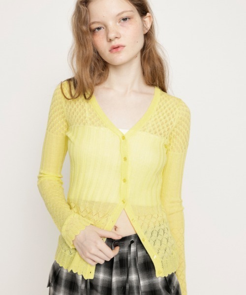 ■POINT:かぎ編みの透け感が涼し気なハイゲージカーディガン。■DETAIL:シアー感のあるハイゲージニット素材にワイドリブとダイヤ柄のクロシェ編みを取り入れました。袖口、裾にはスカラップデザインを取り入れた事で着用するだけで華やかで女性らしい印象に。あえてななめに配置した釦ディティールもポイント。■STYLING:コンパクトなサイズ感なのでボトムも選ばず、今の時期からトップスとしても真夏の時期の羽織としても長く万能に使っていただけるアイテム。■透け感:あり■光沢感:なし■伸縮性:なし■裏 地:なし※本品は素材の特性上色落ちします。洗濯、クリーニング、着用(使用)時に他の衣類や雑貨、家具類に色移りする事があります。特に汗や雨等で湿った状態では、色落ちが顕著になります。白、淡色との組み合わせは避け、お取り扱いには十分ご注意下さい。本品は、生地表面が摩擦されると繊維が毛羽立ち、光の反射で白く見える事がありますが色落ちではありません。特に湿った状態での過度な摩擦は白化の原因となりますのでお避け下さい。[注意事項]※画像の商品はサンプルです。実際の商品と仕様、加工が若干異なる場合があります。※画像の商品は光の照射や角度、お使いのモニター環境により、実物と色味が異なる場合がございます。※着用、お取り扱いの際は、アテンションタグをご確認ください。※一部予約商品につきましては生産上の都合によりお届け予定日や店頭発売と前後する場合もございます。※追加生産商品は、一部の店舗、通販で販売中の場合がございます。予めご了承下さい。【SLY/スライ】「Casual」「Girly」「Mode」をベースに発信する、ディテールへのこだわりが詰まった、どこか必ず女性らしさを感じるアーバンスタイル。 さまざまなエッセンスをミックスした、時代の空気を体現するコレクションを展開。 ▼商品のお気に入り登録 お気に入りアイテムの値下げ・再入荷・在庫5点などの通知を受け取ることができます。 ▼ブランドのお気に入り 登録新商品や再入荷、セール、クーポン配布などお得な情報を受け取ることができます。※こちらの商品はSLY独自の採寸方法となっています。本サイトのサイズガイドと採寸方法が異なる場合がありますのでご了承ください。