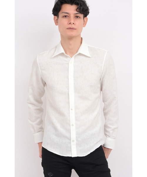 【DESIGN】 細やかなムラのジャカードジャカード織柄が上品な印象を添えてくれる長袖レギュラーカラーシャツ。 清涼感のある素材感が春夏スタイルにオススメの一着となっています。 【TEXTILE】 ロック(岩肌)のような柄をジャカードで織り上げ、整理の段階で縮めることで繊細な表面感と少しのストレッチ性を持たせています。 肌への接地面が少なく、カリッとした風合いが清涼感のある素材です。