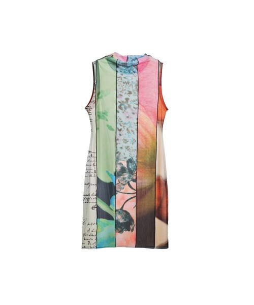 【デザイン】 異なるテイストのアートワークを縦にパネル状につなぎ合わせた独創的なノースリーブミニドレス。パステルグリーン、水彩調のブルー、ソフトピンクなど、優しい色彩のパネルに、手書きの文字、花のモチーフ、抽象的なグラデーションが調和しています。スタンドカラーがモダンな印象を与え、すっきりとしたIラインシルエットが都会的な洗練さを演出。薄手の素材感で軽やかな着心地を実現した、アート作品のような一着です。 【スタイル】 芸術的感性あふれるこのドレスは、シンプルなアクセサリーとの相性が抜群。単体でも存在感があるため、ミニマルなサンダルやフラットシューズを合わせたスタイリングがおすすめ。暑い季節には一枚で、肌寒い日には細身のカーディガンを羽織るとバランスよく決まります。タートルネックのストラップ付き。 <information> ・アイテムのお気に入り登録 お気に入りした商品の入荷状況や、残り1点となった際の通知、セール情報などをお届けいたします。 ・ショップのお気に入り登録 最新コレクションの入荷情報や品切れ商品の再販売、ショップニュースなど、さまざまな最新情報をご案内いたします。 <Pick up> 店舗取り置きサービスがスタートいたしました。ご注文の商品を最短即日、お近くの店舗でお受け取りいただけます。 【Desigualデシグアル】 バルセロナ発のファッションブランド「Desigual(デシグアル)」。スペイン語で“他とは違う”という意味が現すとおり、他のブランドにはない地中海をイメージさせるカラフルな色使いやエキゾチックなパターン、パッチワークやデニムなど着る人の個性を引き立てるアイテムを展開。デイリーにも、ドレスアップにも活躍する幅広いデザインが魅力。レディースだけではなく、メンズやシューズなど幅広いラインナップを展開。ブランド名にもなっているDesigual(他とは違う)は、自分自身が他の人と違うことがどれだけ大切で楽しいことなのかを改めて感じてもらいたいという私たちの願いが込められています。 自由で楽しく、カラフルで前向き。本当の自分を呼び覚ます鮮やかなカラーやプリント、他とは一味違うスタイルはファッションを楽しくするものばかりです。