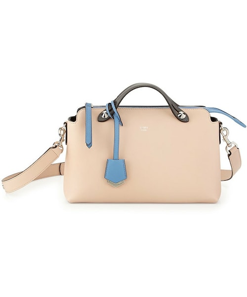 Fendi two-tone calf leather satchel. Silvertone hardware. Double top handles with studs; 2" drop. Detachable adjustable shoulder strap; 13.5" drop. Zip top extends down one side. Hanging covered logo tag. Inside, center zip pocket. 7"H x 12"W x 6"D. Made in Italy.