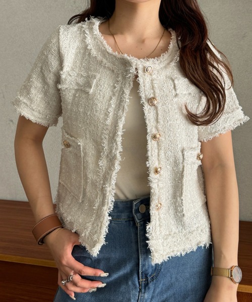 【efill / エフィル】★SSアイテムが登場!★ 「春夏にぴったり、軽やかなショートツイードジャケット。」ツイード素材のジャケットが登場!シンプルながらも高級感が漂い、ゴールドのボタンが華やかさをプラスしています。ショート丈と軽やかなデザインが、春から夏のシーズンにぴったり。カジュアルにもエレガントにも着こなせる万能アイテムです。■Point・ツイード素材で、しっかりとした風合いと上品な印象・ゴールドボタンが華やかさを引き立て、シンプルながらも高級感を演出・ショート丈で、軽やかに羽織れてスタイルアップ効果・シンプルでありながら、細かいディテールが魅力的■Fabric-------------透け感: なし厚さ: 普通伸縮性: なし裏地: なしポケット: あり-------------【efill】1日のうちに触れる洋服やアクセサリー。ライフスタイルに合わせコーディネートを考え、1日をスタートさせると思います。[e]very(毎日)[f]ill(満たす)efill.を通してファッションから毎日の幸せ・ワクワクする楽しさ・パワー、刺激を共有していきたいです。efill.は「誰もが着れる締麗め大人アイテム・デートにも着て行けるプチプラアイテム]をお届けします。■Instagram【@hono_21_ @efill_official】Instagramにて新作情報更新中ここには載っていない写真も掲載しているのでぜひチェックしてみてください!■Coordinateカジュアルコーディネート:ブラックのスカートやジーンズと合わせて、カジュアルでありながらエレガントなスタイルに。シンプルなTシャツやタンクトップを合わせて、日常使いにぴったり。エレガントコーディネート:ドレッシーなワンピースやスカートに合わせて、きれいめコーディネートに。ヒールやパンプスで、さらに上品さを引き立てます。デイリーコーディネート:シンプルなトップスやカジュアルなボトムスと合わせ、ちょっとしたお出かけにも最適。スニーカーやフラットシューズで、軽快に仕上げます。※ご覧のモニター環境により、画像の色味と多少異なる場合がございます。★お買いものをよりお楽しみいただく為に!★■お気に入り登録[♥マーク] を押すと登録完了!お気に入りアイテムの値下げ・完売カラーの再入荷・在庫1点などの通知を受け取ることができます。・ブランドのお気に入り登録新商品や再入荷など、いち早くブランドのお得な情報を受け取ることができます。-ブランドの最新情報はinstagram【@efill_official】でご確認いただけます!