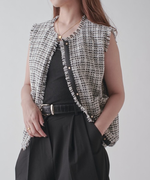 《 Lui's FEMME(ルイス ファム)オリジナル25SSコレクション 》ツイードジレ●デザインツイードデザインがオトナな上品な印象になるジレ。羽織るだけで、目を惹くツイードデザインなので春から使いやすいアイテムです。●素材ツイード素材の着やすいジレ。●スタイリングインナー次第で、オケージョンから普段使いまで幅広く着用可能。普段使いするときに、カジュアルダウンでデニム合わせするのも◎**********************透け感:なし裏地:なし伸縮性:なし光沢感:なし生地の厚さ:普通**********************【ブランド】Lui's FEMME(ルイス ファム)凛とした芯のある女性。 自立した、女性のワードローブをイメージ。洗練されたかっこよさの中に、女性らしさ・かわいさ・セクシーさを持つ。自分自身のスタイル(自分らしさ・個性・生き方・感覚...)を表現できるひとつの手段としての服。肩肘張らない、心地よいリラックス感のあるスタイルを上質な素材、優雅なシルエットで提案。 《商品画像について》ご覧頂いている商品の写真につきましては、できるだけ実物の色に近くなるように努めておりますが、お使いの環境(モニター、ブラウザ等)の違いにより、色の見え方が実物と若干異なる場合がございます。 予めご了承ください。《予約商品について》・こちらの商品はサンプルでの撮影・計測となっております。実際の商品とは、商品の一部仕様が変更になる場合がございます。・撮影サンプル品はブランドタグがついておりません。製品にはタグがつきますので、製品の表に縫い糸が見えたり、着用時にタグが透ける場合がございます。・サンプルの為、混率の詳細が確定しておりません。確定次第、記載いたします。・工場の生産の都合上、納期が変更になる場合がございます。発送日の前後についてはあらかじめご了承ください。・入荷状況により、お客様への発送が店頭販売より遅れる場合もございます。・店頭に陳列していた商品も含まれる場合がございます。《ハートをタップして商品のお気に入り登録》登録カラーの商品の「残りわずか」「再入荷」「値下げ」通知を受け取ることができます。各ショップアプリにてブランドフォロー 新商品などの入荷情報、最新のニュースやお得な情報を受け取ることができます。