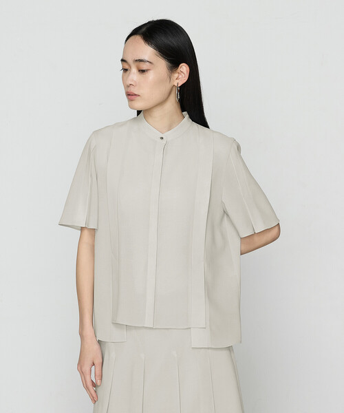 《デザイン》シャープなラインのタックがスマートな印象の半袖ブラウスです。細めのバンドカラーが首元をすっきりと見せてくれます。身頃と袖タックは途中からふらしにすることで、エアリーで涼しげな仕上がりです。前開きの部分は比翼仕立てにすることですっきりとさせ、よりたてラインを強調しています。一番上のボタンだけ華奢なメタルボタンにし輝きをプラスしています。身頃は裾の丈に差をつけることで動きを付けると共に前をインしなくても決まり、パンツにもスカートにも合わせやすくしています。《素材》絶妙な膨らみがありつつ、程よいはりがあるボイル素材です。微起毛感のある滑らかなタッチと繊細な表面感は合撚でありながら、 梳毛のような質感が特長です。アチェローザダブルクロスの色味とぴったり合わせ、簡単にワントーンコーデが叶うシリーズです。お手入れ方法:手洗いOK