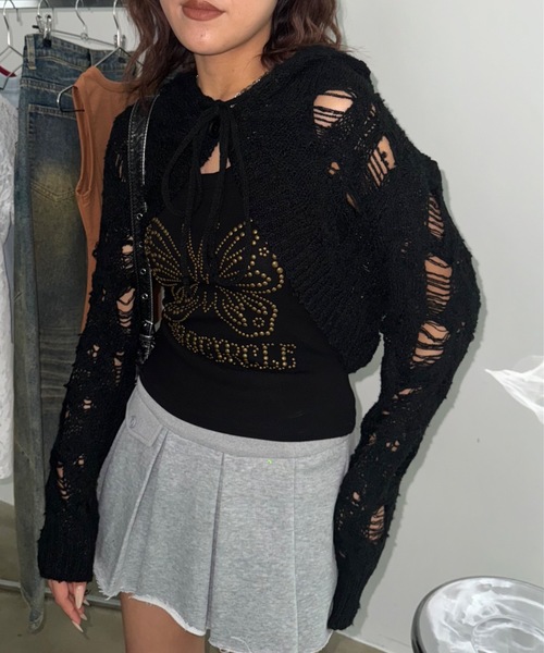 【2025 Spring Summer Collection】◆使い勝手抜群♡フード付きニット♡▷POINT今っぽいクロップド丈のフード付きボレロ。キャミワンピの上に重ねたり、少し肌寒い日に重ね着する羽織など、コーディネートのアクセントとして使い方は様々!インナー次第で、ロングシーズンで着用いただけます♡胸元のリボンで女の子らしさを演出し、ダメージ加工がグランジスタイルにもマッチす♡▷STYRINGショート丈でバランスが取りやすいため、フルレングスのボトムや、ワンピースなどと相性抜群です♡透け感があるため、柄物のインナーとの合わせもかわいい♡・・・・・・・・・・・・・・・・・・・・・・透け感:あり裏地:なし伸縮性:ややあり光沢感:なし生地の厚さ:普通・・・・・・・・・・・・・・・・・・・・・・■SHAGGIE(シャギー)一人ひとりに合ったなりたい姿を“STREET”“CASUAL”のスタイルで提案する■公式インスタグラム【shaggie_official】ZOZOTOWNに掲載してない入荷情報や着用感など随時更新しております。是非チェックしてみてください。▼商品のお気に入り登録お気に入りアイテムの値下げ・再入荷・在庫1点などの通知を受け取ることができます。▼ブランドのお気に入り登録新商品や再入荷、セール、クーポン配布などお得な情報を受け取ることができます。※画像の商品はサンプルです。実際の商品と仕様・加工・サイズが若干異なる場合がございます。※照明の関係により、実際よりも色味が違って見える場合があります。またパソコン・スマートフォンなどの環境により、若干製品と画像のカラーが異なる場合もございます。予めご了承くださいませ。・洗濯:手洗い可