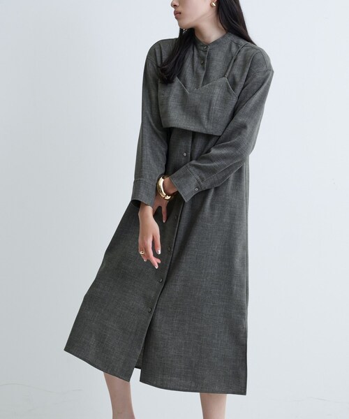 Design Pointビスチェがセットになったこのシャツドレスは、一枚でコーディネートが完成するアイテム。ビスチェレイヤードでトレンド感をプラスし、シンプルながらアクセントのあるスタイルが楽しめる一着です。大人でも着こなしやすいよう上品見えする仕上がりです。Styling Pointシューズやアクセサリーを足し引きすることで、幅広く活用できるシーンレスな一着。ボトムレイヤードでリラクシー感のあるコーディネートもバランス良く決まります。Fabric Point軽やかで動きやすく、シワになりにくい素材。季節を問わず着こなせるイージーケアなアイテムです。※照明の関係により、実際よりも色味が違って見える場合があります。また、パソコン・スマートフォンなどの環境により、若干製品と画像のカラーが異なる場合もございます。店舗へのお問い合わせ商品番号:523-52014●製品寸法:36(S):ワンピース着丈115cm ワンピースB96cm ワンピース袖丈51cm ワンピース肩幅52cm ビスチェB97cm38(M):ワンピース着丈117cm ワンピースB99cm ワンピース袖丈52cm ワンピース肩幅53cm ビスチェ着丈32cm ビスチェB100cm40(L):ワンピース着丈119cm ワンピースB102cm ワンピース袖丈53cm ワンピース肩幅54cm ビスチェB103cm備考: