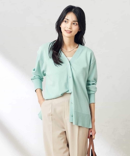 ◆一枚あると頼れるベーシックカーディガン◆ 【デザイン】 ・春まで着られるVネックカーディガン ・腰周りをしっかりと覆う安心の着丈 ・サイドスリット入りですっきりした印象に ・コンパクトに畳めて持ち運びもしやすいのが嬉しいポイント ・春らしいグリーンと合わせやすいベージュの二色展開 【素材】 ・ドライタッチ素材を使用したしっかりした肉感 ・さらっとした着心地 【コーディネート】 シャツやブラウスからTシャツ合わせはもちろん 一枚着でプルオーバー着用も可能です。 お出掛けや旅行の羽織りアイテムとしてもおすすめです。 -------------------- 透け感:なし 裏地:なし 伸縮性:あり 光沢感:なし 生地の厚さ:ふつう -------------------- ≪お気に入り登録機能の使い方≫ ■商品のお気に入り登録(ハートマークをクリック) 再入荷通知や値下げ等、お得なご案内を受けることができます。 -------------------- ※商品画像は、光の当たり具合やパソコンなどの閲覧環境により 実際の色味と異なって見える場合がございます。 商品の色味の目安は商品単体の画像をご参照ください。