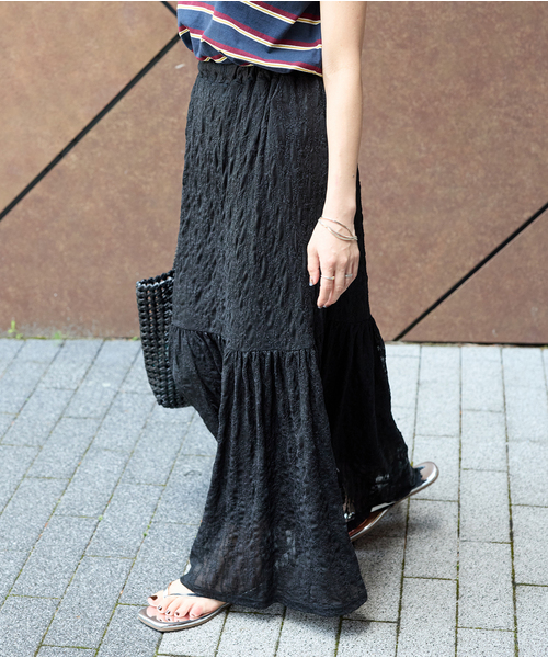 【2025 SS】JOURNAL STANDARDイージーな穿き心地のティアードレーススカート。ストレッチ性のあるカットソーレースを使用しているため、落ち感があって広がりすぎないのがポイント。ゆったりしたスウェットやニットなどのトップスやシャツなどのハリ感があるものと合わせてもバランスが取りやすく、着回し力のあるスカートです。※カラーによって取り扱いが異なります。※取り扱いについては、商品についている品質表示でご確認ください。※照明の関係により、実際よりも色味が違って見える場合があります。またパソコン・スマートフォンなどの環境により、若干製品と画像のカラーが異なる場合もございます。※商品の色味は、商品アップ画像をご参照ください。本体:手洗い可能