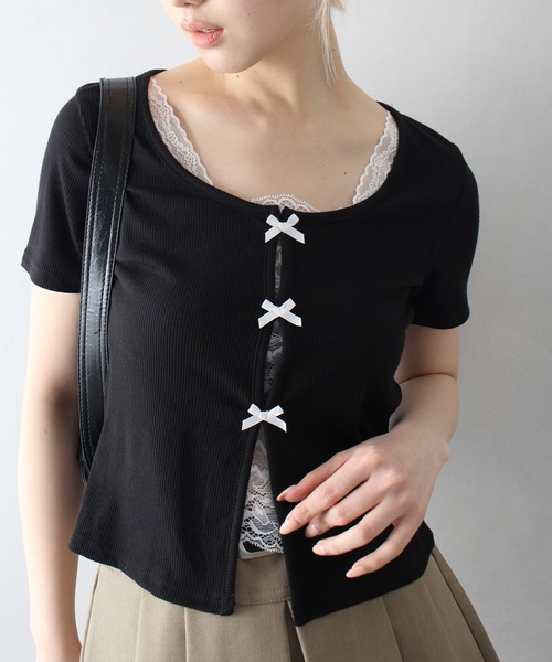 【SpRay テレコレ-スリボントップス】ガーリーなディテールが詰まった テレコレースリボントップス。 レースのトリムとフロントのリボンが 甘さをプラスしつつ、 程よくフィットするシルエットで 大人かわいい印象に仕上げた1枚。フェイクレイヤードされたレースインナーがフロント周り、デコルテをキレイに見せてくれコンパクトなデザインでスタイルアップ効果も◎テレコ素材ならではの程よい伸縮性があり、 体に馴染む着心地の良さも◎ Styling デニムやカーゴパンツと合わせて カジュアルダウンした甘辛MIXコーデに。 ミニスカートと合わせれば 韓国風ガーリースタイルも◎ フリルティアードミニスカートなどで人気のバレエにもおすすめ♪ #レディース#トップス#カットソー#レイヤード#リボン#レース#テレコ#レース#リボンモチーフ#フリル#韓国風【素材感】柔らかく肌触りの良い生地。※詳しいお手入れ方法は商品タグをご参照ください。◆伸縮性有り ◆透け感無し ◆裏地無し 【商品のお気に入り登録】完売カラーの再入荷通知やラスト1点の通知プライスダウンの通知も受け取ることができます。ぜひご登録ください◎【ブランドのお気に入り登録】新商品や再入荷など、いち早く情報を受け取ることが出来ます。※輸送時による、多少の汚れ・シワがある場合がございます。※撮影時のライティング、ご覧になっているモニター・PC環境により実際の商品と色味が異なって見える場合がございます。ご了承の上お買い求め下さい。