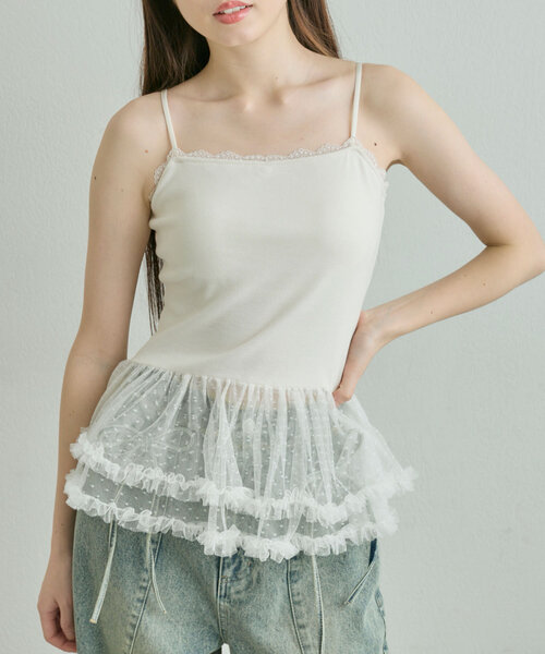 ふわっと甘さをプラスする着映えインナー ■デザイン ・ふんわりと揺れる繊細なフリルや胸元のさりげないレースが、フェミニンな雰囲気を演出します。 ・裾部分はオフが無地にレース、アイボリーがドット柄にフリルのデザインです。 ・細めのストラップ&コンパクトなシルエットで、すっきりとした着こなしが叶います。 ・柔らかく伸縮性のある素材なので、ボディラインに沿うシルエットながらも締め付け感がなく、肌に優しくなじむ快適な着心地です。 ■カラー ・オフ/アイボリーの2色展開 ■スタイリング ・デニムパンツと合わせて、甘さとカジュアルのバランスが絶妙なスタイリングに。 ・クロップド丈のトップスを合わせて、裾からふわふわのチュールが見えるように着てもかわいいです。 ・カップ付きなので下着のラインを気にせず着用していただけます。 ----------------------------- 裏地:なし 光沢感:なし 透け感:なし(チュール部分あり) 伸縮性:あり 手洗い:可能 タンブラー乾燥:不可 アイロン:110℃まで ----------------------------- model:166cm ※着用、お取り扱いの際は、商品についている品質表示とアテンションタグを必ずご確認下さい。 ※ご覧のモニター環境や撮影環境により実際の商品と多少色味が異なって見える場合がございます。ご理解の程よろしくお願いいたします。 ※引っかけ注意 ・粗い組織のものや、表面に凹凸があってルーズな組織のもの 表面に糸が浮き出ているものは、ちょっとした不注意から引っかけてしまいがちです。 取り扱いの際は取り扱い絵表示確認の上、十分注意してください。 ・着用時にベルトや、バックや周囲の壁など表面の粗いものとの摩擦や引っかかりに注意してください。 ・水洗いやクリーニングの際にも他の物ものとの引っかかりに注意して下さい。 ■お気に入り登録のおすすめ 【気になるアイテムを登録】 ハートをクリックしてお気に入りに登録すると 完売カラーの再入荷やラスト1点の通知、セールの通知を受けとることができます。 【ブランドを登録】 新商品や再入荷、セール通知など、いち早くブランドの情報を受けとることができます。