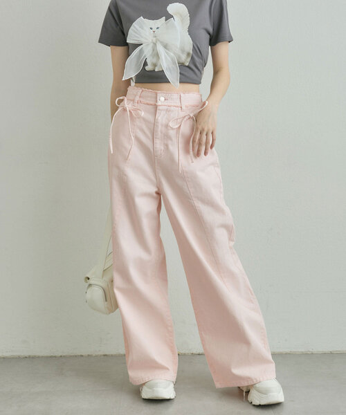 さりげないリボンがかわいいデニムパンツ■デザイン・2つのリボンやウエストのフリンジなど、さりげないディティールが特別感のあるデザイン。・ワイドシルエットで足のラインを拾わず、ゆるっと着れて体型カバーも叶います。・フロントに施された切り替えデザインが、全体のシルエットをよりきれいに見せてくれます。・S/Mサイズ展開なので、身長に合わせて丈をお選びいただけます。■カラー・ピンク/サックス/ブルーの3色展開■スタイリング・コンパクトなサイズ感のトップスを合わせると、バランスの取れたメリハリのあるコーデになります。・ガーリーデザインのトップスとも相性◎・足元は厚底スニーカーやスポーツサンダルがおすすめ。-----------------------------裏地:なし光沢感:なし透け感:なし伸縮性:なし手洗い:可能タンブラー乾燥:不可アイロン:150℃まで-----------------------------model:166cmお取り扱い上の注意※キャンペーンやフェアにより価格が変動する場合がございます。※サンプルで撮影している為、実際の商品と若干仕様が異なる場合がございます。※着用、お取り扱いの際は、商品についている品質表示とアテンションタグを必ずご確認下さい。※ご覧のモニター環境や撮影環境により実際の商品と多少色味が異なって見える場合がございます。ご理解の程よろしくお願いいたします。※引っかけ注意・粗い組織のものや、表面に凹凸があってルーズな組織のもの表面に糸が浮き出ているものは、ちょっとした不注意から引っかけてしまいがちです。取り扱いの際は取り扱い絵表示確認の上、十分注意してください。・着用時にベルトや、バックや周囲の壁など表面の粗いものとの摩擦や引っかかりに注意してください。・水洗いやクリーニングの際にも他の物ものとの引っかかりに注意して下さい。■お気に入り登録のおすすめ【気になるアイテムを登録】ハートをクリックしてお気に入りに登録すると完売カラーの再入荷やラスト1点の通知、セールの通知を受けとることができます。【ブランドを登録】新商品や再入荷、セール通知など、いち早くブランドの情報を受けとることができます。