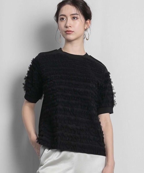 ■商品説明シルケット素材のカットソーの上に巾の異なるチュール素材のフリルを叩きつけたデザイントップス。フリルの幅を少しづつ太くして肩や、胸まわりにボリュームが出過ぎないようにデザインしました。透け感を気にせずにチュールのシアー感や軽やかさを楽しめます。襟ぐりと袖口にはニットリブを使用してTシャツ感が出過ぎないようしているのでキレイ目な着こなしにも合わせやすいアイテムです。■使用上の注意濃色の物は汗や雨でぬれた時、又は強い摩擦により色移りすることがあります。濡れた状態での放置、重ね置きをしないでください。軽く押し洗いをして下さい。蛍光増白剤の入っている洗剤を使用しないで下さい。あて布使用。プリント部分にはアイロンはおさけ下さい。表面の粗いものとの擦れにより引っかけや毛羽立つことがあります。着用や取扱いにはご注意ください。===========================厚み:普通伸縮性:あり裏地:なし透け感:ややあり生地感:普通洗濯:手洗い可===========================【RAWFUDGE/ローファッジ】30代の女性が着たいリアル服を作りたいそんな思いから女性が中心となり立ち上げたブランドです。【Mode】【Standard】【Luxe】をキーワードに大人女性に向けシンプルの中に遊び心のあるシャツ・ブラウスを中心に心地良さとオシャレを両立させる、ありそうでない進化系リアルクローズを提案します。
