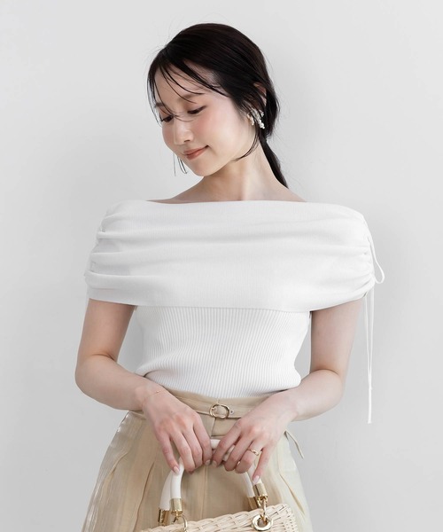 ◆2025SS新商品◆ ヘルシーな肌見せが叶う華奢見えするオフショルニット。 コンパクトな着丈と優しく身体にフィットするシルエットが女性らしさを高めてくれる一着です。 POINT ・肩周りを華奢に見せてくれる広めの折り返し襟 ・折り返し襟部分にはギャザーをあしらい、女性らしさをプラス ・襟の長さ調整が可能なサイドのドロストリボン ・身頃は伸縮性のあるリブ編みで程よく身体にフィット ・インでもアウトでもちょうど良い丈感 COORDINATE シンプルなデザインのため、ワイドパンツやフレアスカートなど、ボトムスを選びません。 様々なコーディネートに取り入れやすい一着です。 - - - - - - - - - - - - - - - 洗濯方法:手洗い可 透け感:カラー名WHITEややあり、その他なし 裏地:なし 伸縮性:あり 生地の厚さ:普通 - - - - - - - - - - - - - - -
