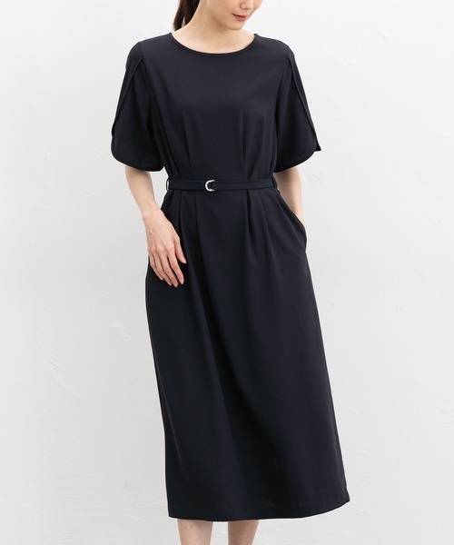 袖コンシャスでフェミニンに【デザイン】気になる二の腕もカバーできる、可愛らしいチューリップ袖。ウエストタックで程よくシェイプした、フェミニンな美シルエット。コーディネートのアクセントになる布ベルト付き。自分にぴったりが見つかる、S~3Lまで揃った豊富なサイズ展開。【素材・機能】程よい厚みで落ち感のあるジョーゼット素材。便利な両サイドポケットと、透けが気にならない、スカートタイプのペチコート付き。【スタイル】パンプス合わせの通勤スタイルにも、スニーカーと合わせたカジュアルスタイルにも、幅広く活躍。●裏地/なし※後中心ファスナー開き※裾後中心ベンツあり付属品●布ベルト付属品●ペチコート品番:534-52-9331