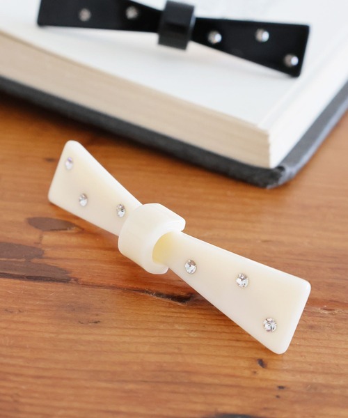 さっと付けるだけのお手軽ヘアアクセ細身のリボンモチーフがレトロライクな印象のヘアクリップ。ドット柄のように配置されたビジューがアクセントになっています。シーズン問わず、幅広いコーディネートにおすすめです。