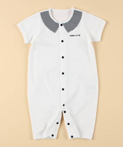 \爽やかギンガム、スタイとあわせて、ギフトにおすすめ♪/《デザイン》ギンガムチェックをおしりパッチと見せかけ衿風に縫い付けて、お尻パッチのロゴプリントが可愛らしい半袖ツーウェイオールです。配色使いのスナップ釦と左胸のロゴプリントは同じ色にしてアクセントにしています。成長の早い時期なので、すぐにサイズアウトしがちなツーウェイオールを少しでも長く着ていただける嬉しいサイズ感にしています。股下のスナップ釦をかけ換えると、新生児型とカバーオール型の2通りの形になり、お子様の成長に合わせて変化させてお使いいただけます。シンプルで上品なデザインなので男の子女の子問わず着用できます。普段着としてはもちろん、お出かけ着にも活躍すること間違いなしの1枚です。同じシリーズで、スタイ(品番:23-46NK09-205)があります。《素材》コットン天竺…きれいな表面感となめらかな肌触りが特徴の天竺素材です。柔らかで伸縮性、吸水性に優れています。ギンガムチェックブロード…ポリエステルとコットンの糸による、吸湿性、速乾性に優れたギンガムチェックブロードです。程よい光沢とナチュラル感で、カジュアル過ぎない絶妙な風合いに仕上げています。ご自宅で洗濯機洗い可能です。※画像の商品はサンプルとなりますので実際の商品と仕様、加工、サイズが若干異なる場合がございます。※こちらの商品はFIVE FOXes独自の採寸方法となっています。本サイトのサイズガイドと採寸方法が異なる場合がありますのでご了承ください。